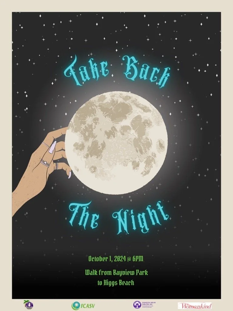Take Back the Night for Monroe County will be held on October 1, 2024, at 6:00 PM in Key West beginning at Bayview Park and we will walk down White Street to Higgs Beach for a moment of silence to honor survivors healing journeys.